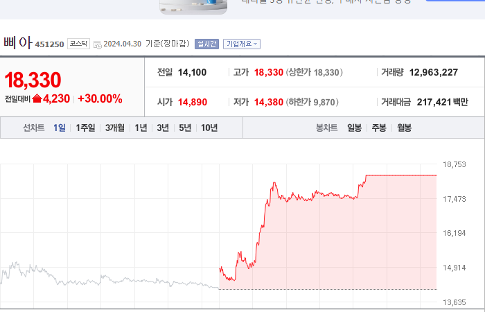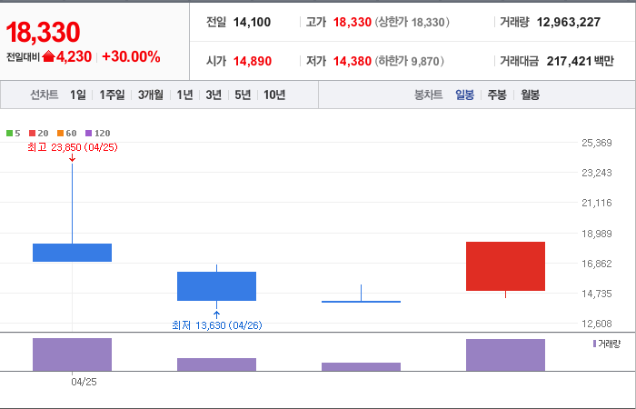 현재가: 18,330, 어제대비:+상한가