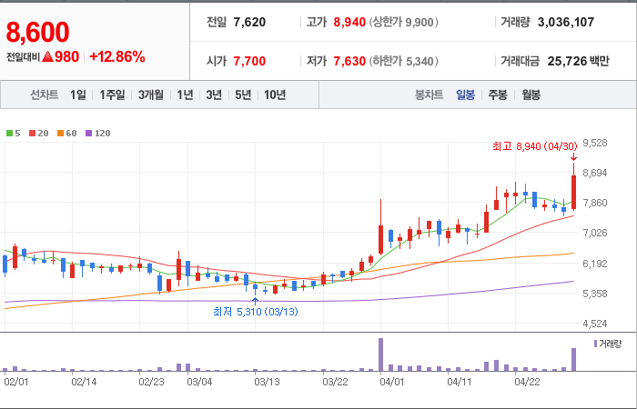 현재가: 8,600, 어제대비:+상승