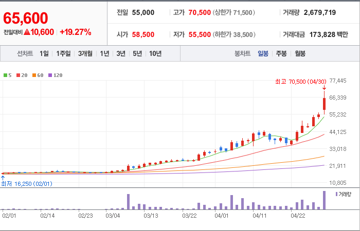 현재가: 65,600, 어제대비:+상승