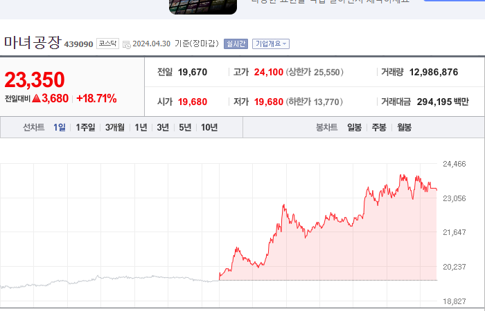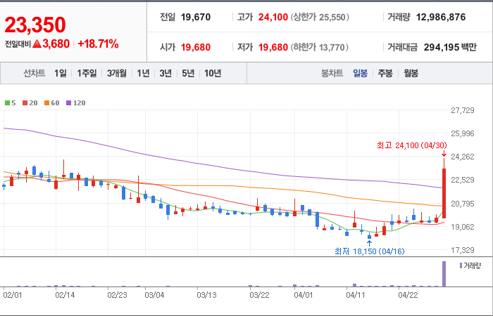 현재가: 23,350, 어제대비:+상승