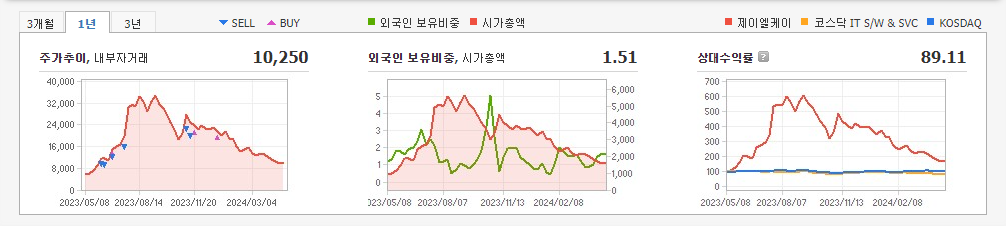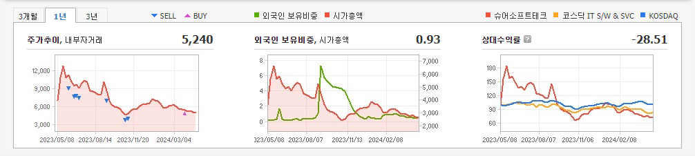2023년 12월 전년동기 대비 별도기준 매출액은 38.9% 감소, 영업이익 적자전환, 당기순이익 적자전환. 게임 사업 매출 급감, 통신장비 부문의 실적도 부진 등으로 외형이 크게 축소되었고 단위당 고정비 부담 증가로 영업손실 및 순손실을 보이며 적자전환함. 동사는 당분기 결산일 이후 단일판매, 공급계약 이행 금액 50% 이상 변경 등의 사유로 불성실 공시법인으로 지정되었음을 공시함.