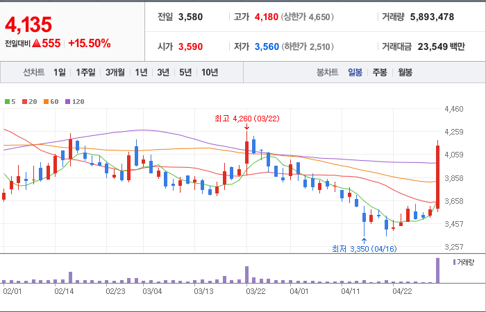 현재가: 4,135, 어제대비:+상승