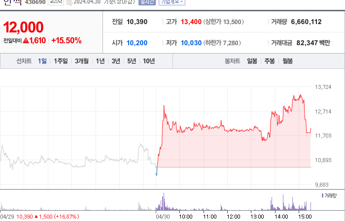 3,680시총: 3,824억원, 거래량:12,986,876, 거래대금:294,195백만