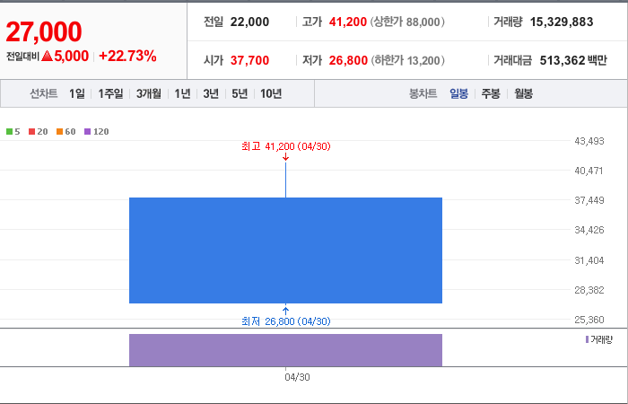 5,000시총: 4,882억원, 거래량:15,329,883, 거래대금:513,362백만