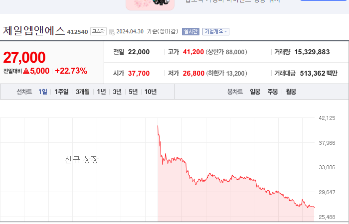 2024.04.30 17:01 / 제일엠앤에스, 상장 첫날 ‘따블’ 실패... 아쉬운 성적표-조세일보 / https://n.news.naver.com/mnews/article/123/0002333112