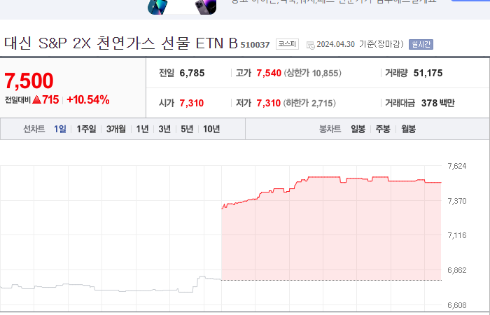 10. 한투 레버리지 천연가스 선물 ETN B 등락률: +9.99%