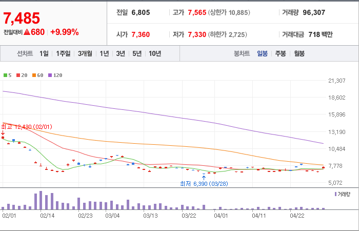 현재가: 7,485, 어제대비:+상승