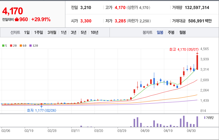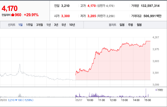 현재가: 4,170, 어제대비:+상한가