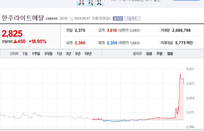 18. 한주라이트메탈 등락률: +18.95%