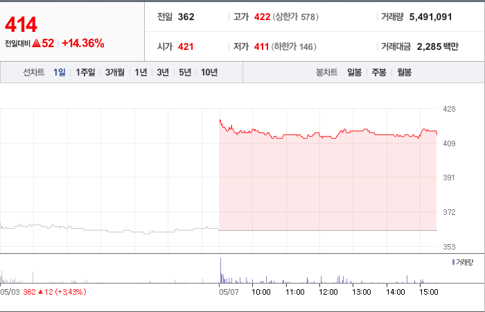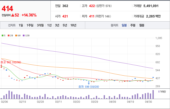 현재가: 414, 어제대비:+상승