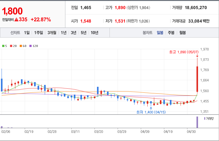 현재가: 1,800, 어제대비:+상승