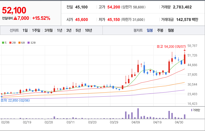현재가: 52,100, 어제대비:+상승