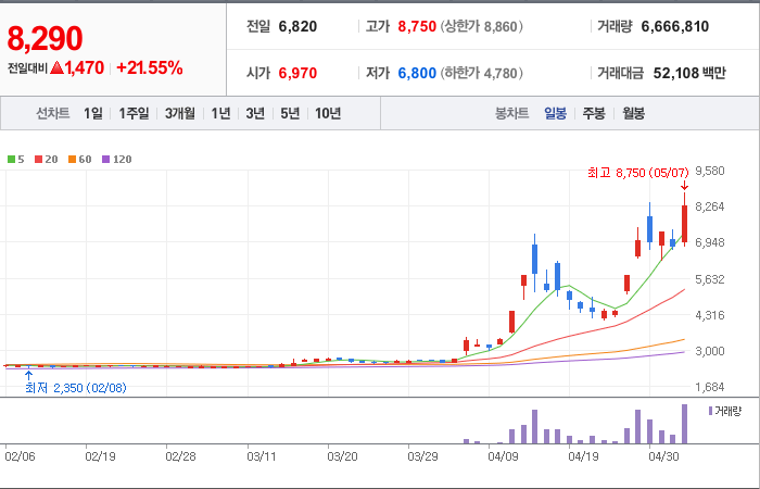 현재가: 8,290, 어제대비:+상승