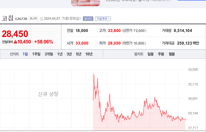 2024.05.07 15:51 / 코칩, 코스닥 상장 첫 날 58% 급등[핫스탁](종합)-뉴시스 / https://n.news.naver.com/mnews/article/003/0012532133