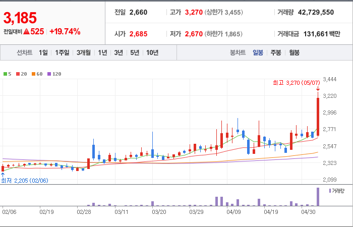 현재가: 3,185, 어제대비:+상승