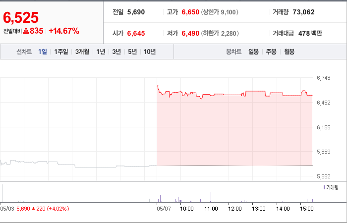 현재가: 6,525, 어제대비:+상승