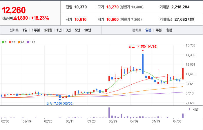 5,390시총: 2,600억원, 거래량:5,671,983, 거래대금:120,545백만