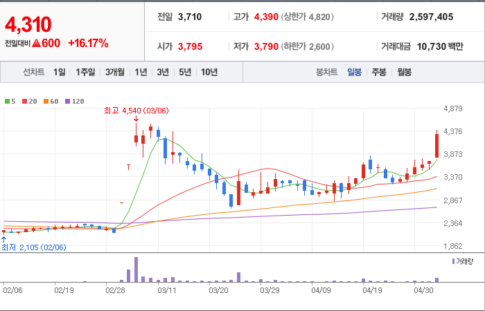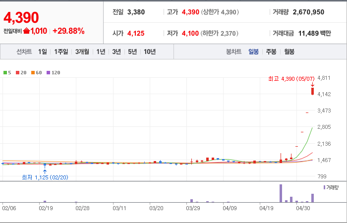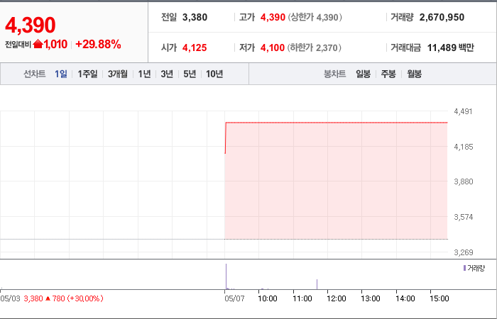 현재가: 4,390, 어제대비:+상한가