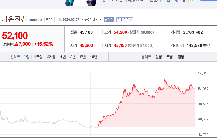 6. 가온전선 등락률: +15.52%