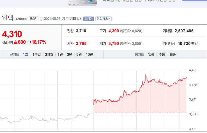 20. 윈텍 등락률: +16.17%