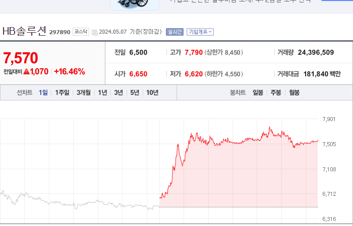 19. HB솔루션 등락률: +16.46%