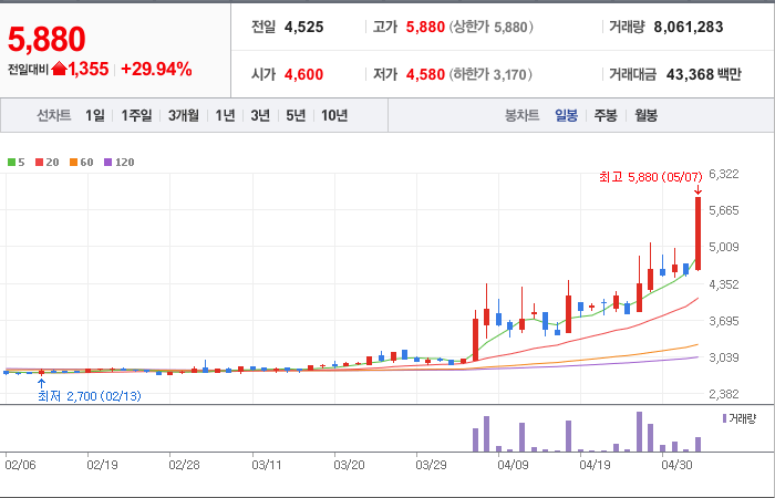 현재가: 5,880, 어제대비:+상한가