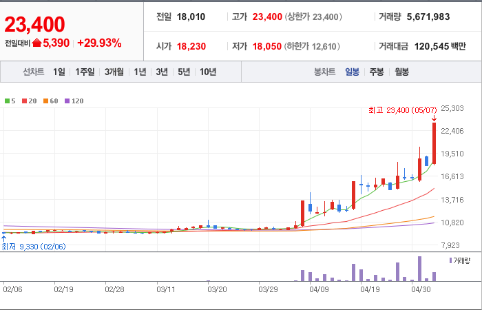 현재가: 23,400, 어제대비:+상한가