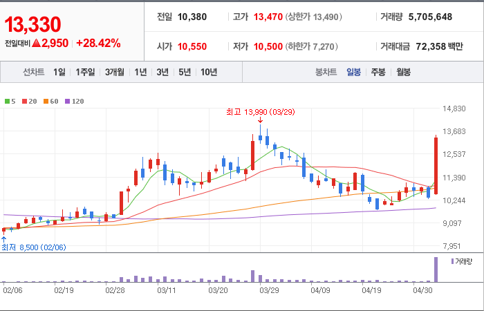 현재가: 13,330, 어제대비:+상승