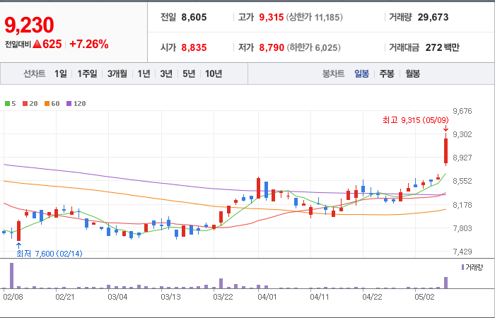 현재가: 9,230, 어제대비:+상승
