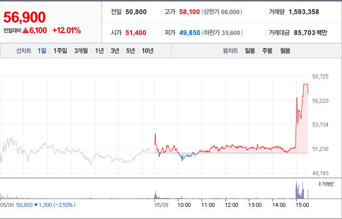현재가: 56,900, 어제대비:+상승