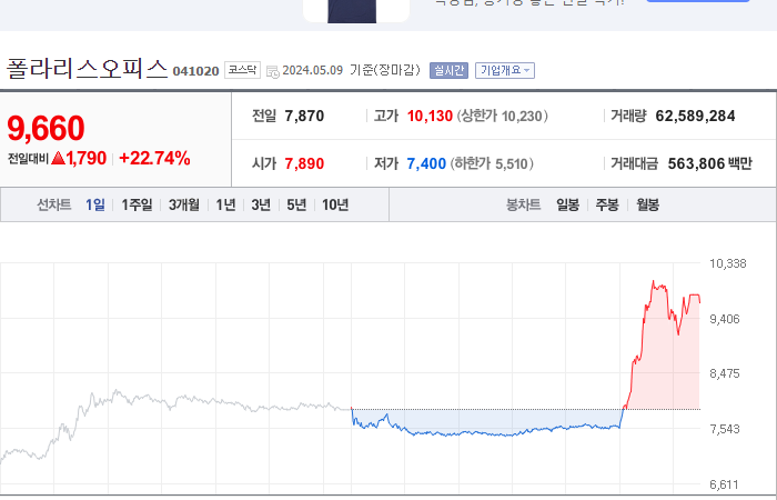 2024.05.09 16:18 / "나 혼자만 주가 업"…시장 새파란데 상한가 찍은 디앤씨미디어[핫종목]-뉴스1 / https://n.news.naver.com/mnews/article/421/0007530883