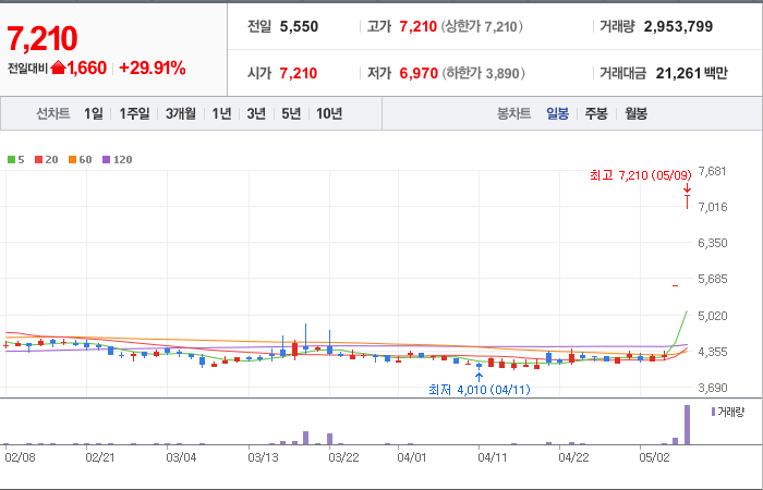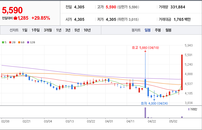 현재가: 5,590, 어제대비:+상한가