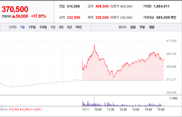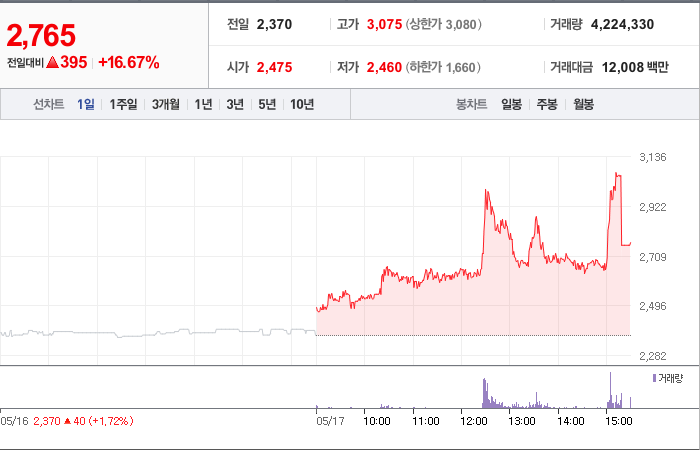 395시총: 1,432억원, 거래량:27,504,570, 거래대금:118,228백만