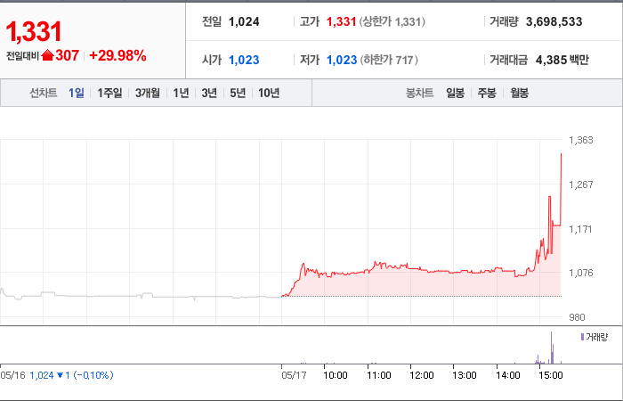 1,320시총: 2,223억원, 거래량:19,195,076, 거래대금:148,491백만