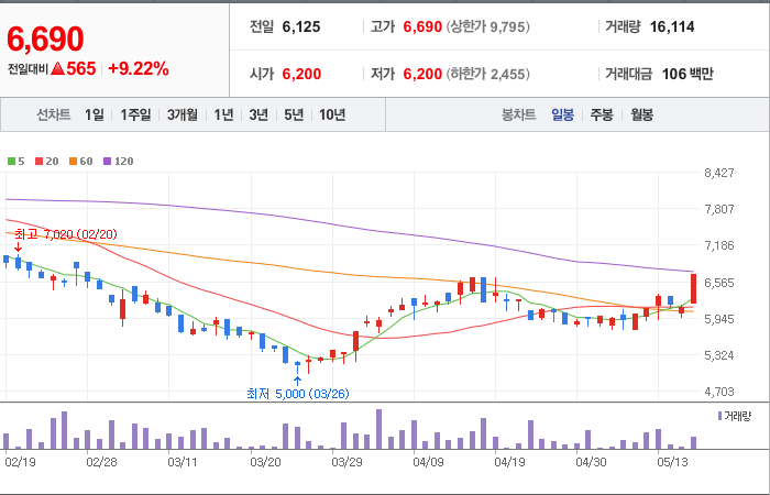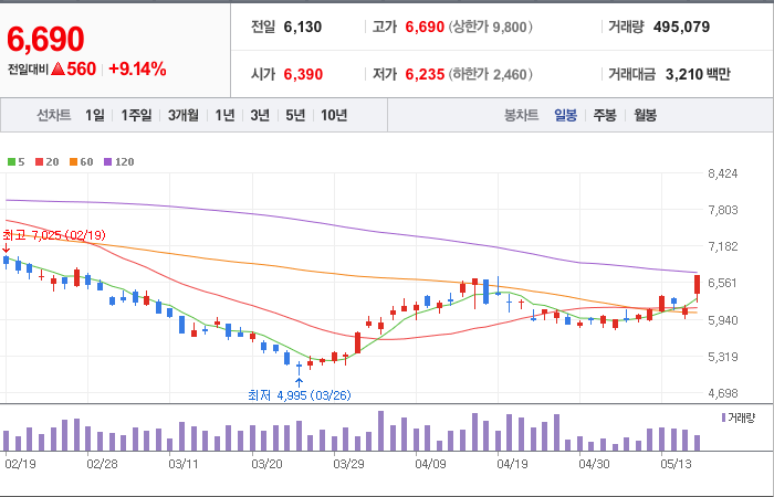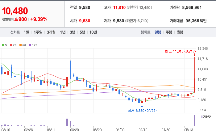 8,700시총: 3,767억원, 거래량:35,700,442, 거래대금:1,064,181백만