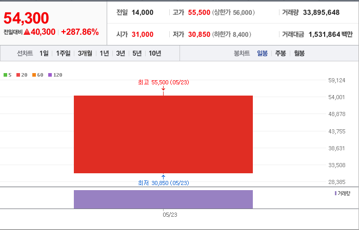 40,300시총: 4,155억원, 거래량:33,895,648, 거래대금:1,531,864백만