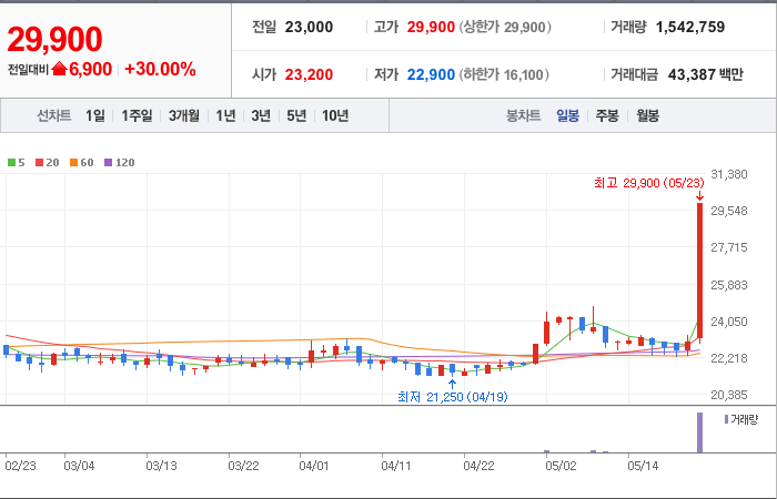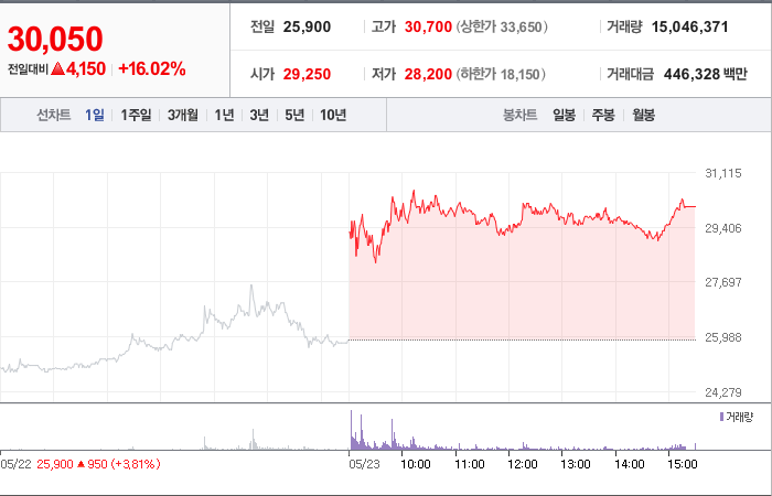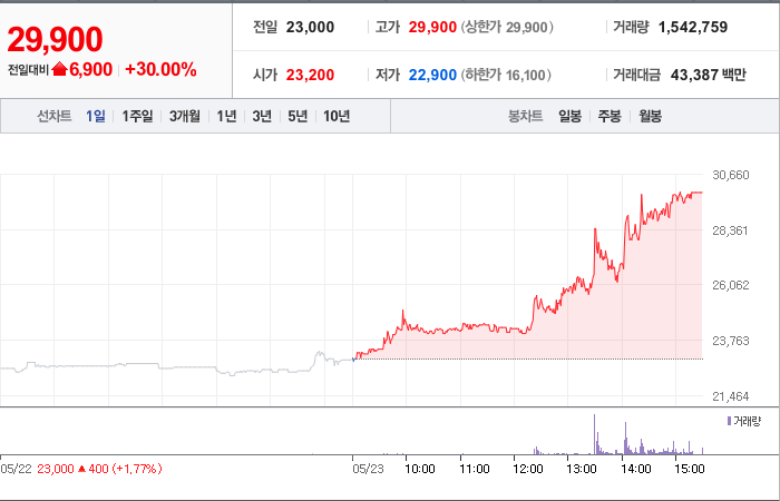 현재가: 29,900, 어제대비:+상한가