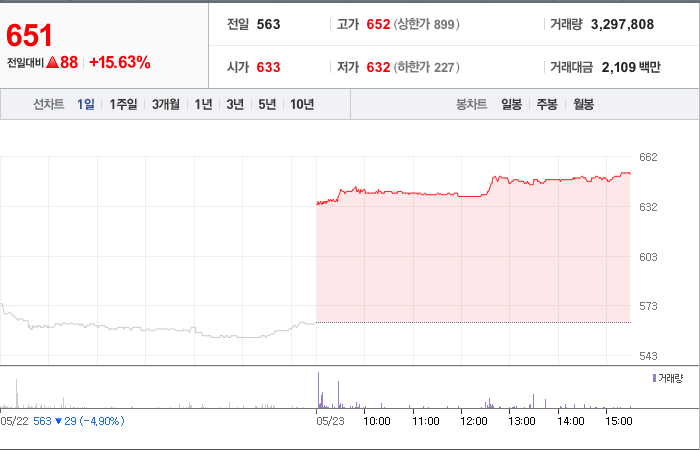 현재가: 651, 어제대비:+상승