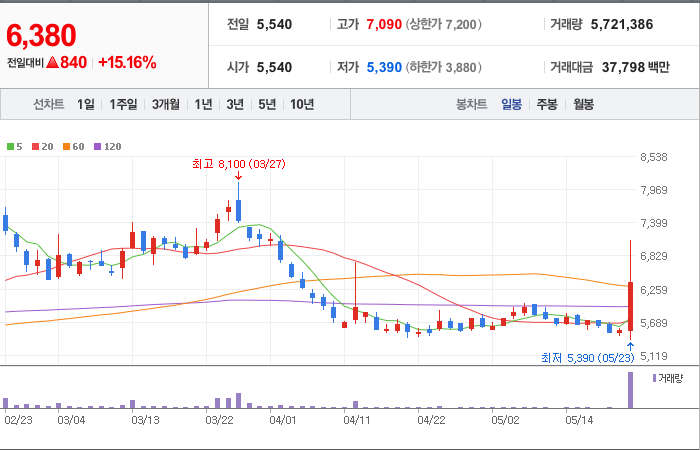 현재가: 6,380, 어제대비:+상승