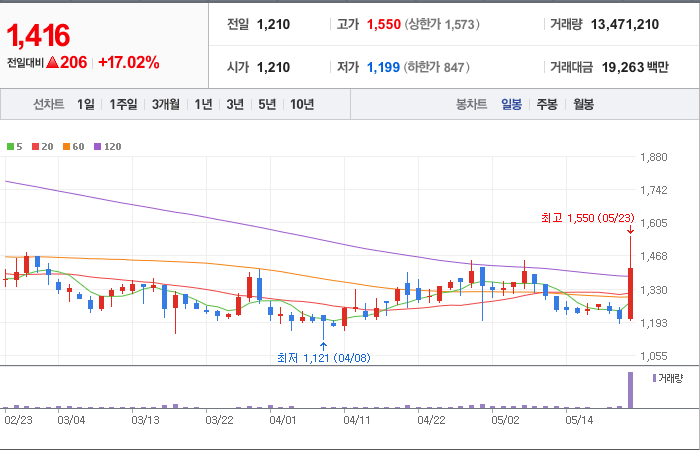 현재가: 1,416, 어제대비:+상승