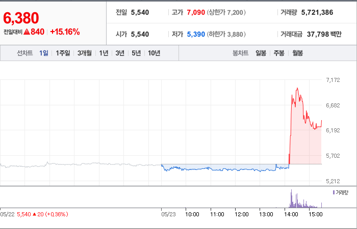 5,250시총: 2,282억원, 거래량:5,371,644, 거래대금:135,399백만