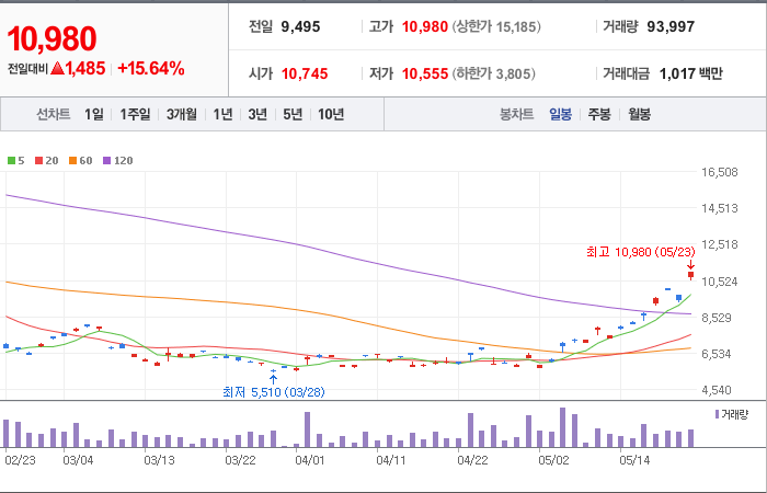 현재가: 10,980, 어제대비:+상승