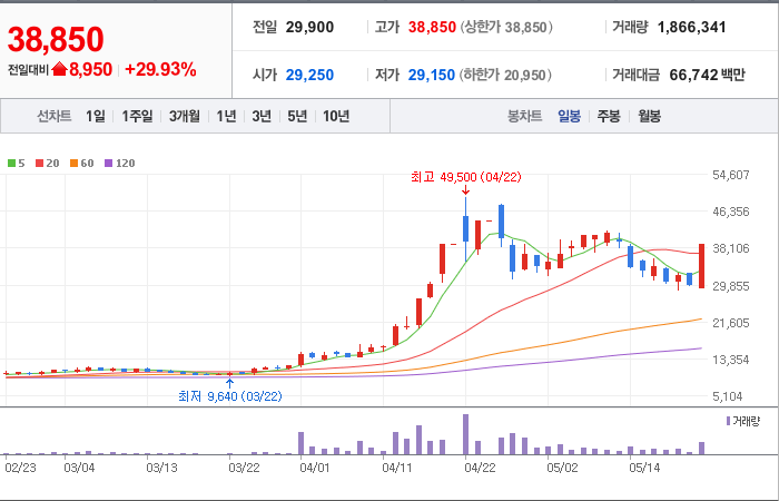 현재가: 38,850, 어제대비:+상한가