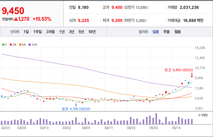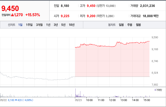 현재가: 9,450, 어제대비:+상승