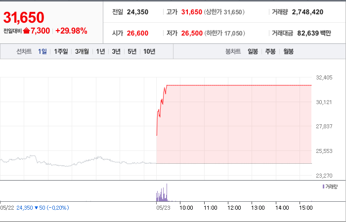 현재가: 31,650, 어제대비:+상한가
