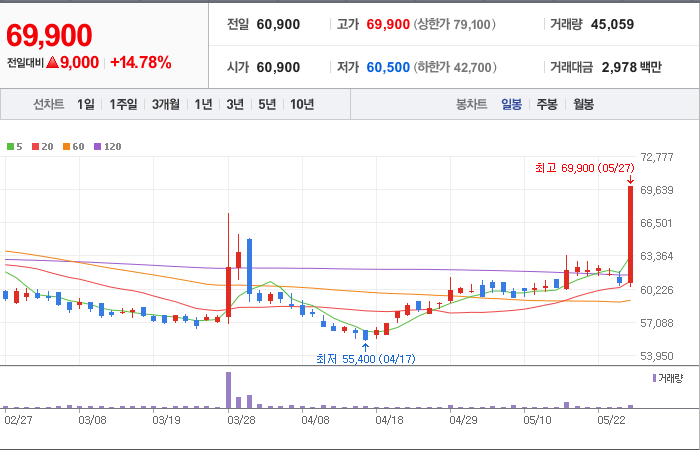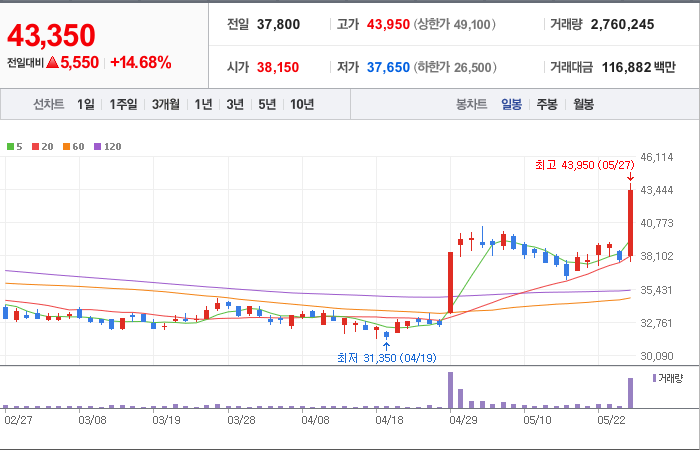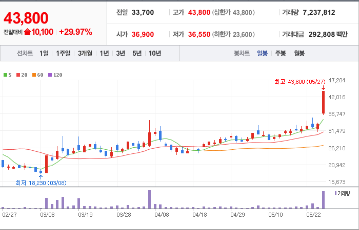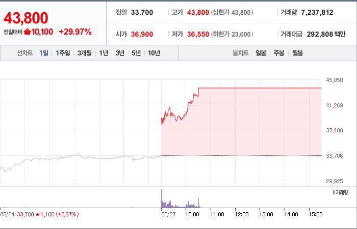 현재가: 43,800, 어제대비:+상한가
