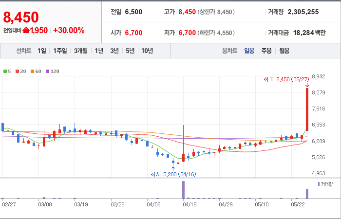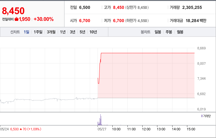 현재가: 8,450, 어제대비:+상한가
