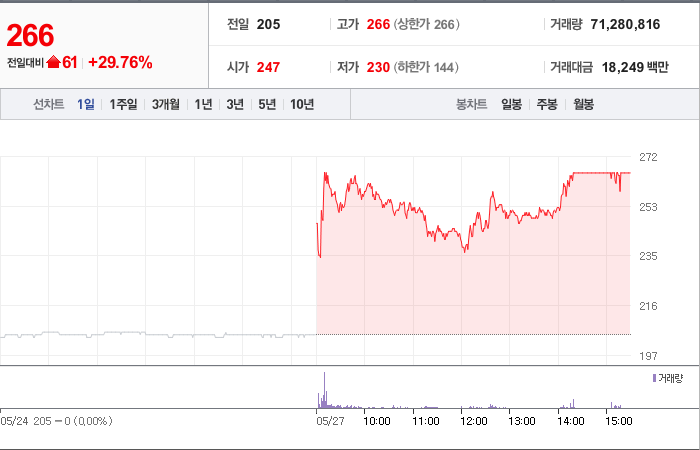 현재가: 266, 어제대비:+상한가
