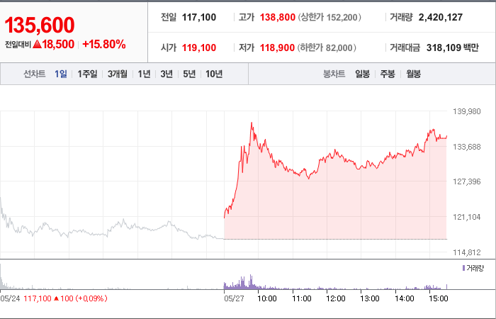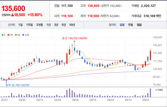 현재가: 135,600, 어제대비:+상승