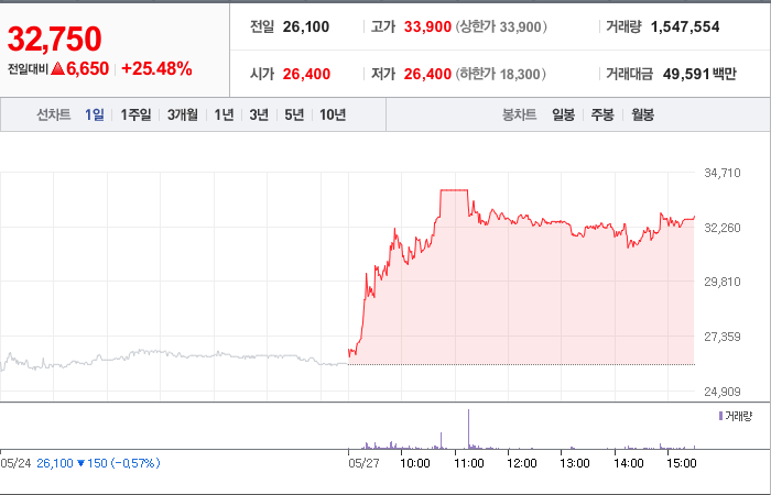 현재가: 32,750, 어제대비:+상승